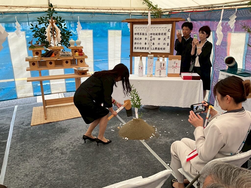 白島の土地にお世話になりますという想いと、事故やトラブルなく無事建設が進みますようにという気合と意気込みのこもった鍬入れでした。