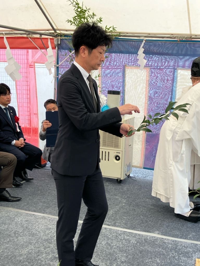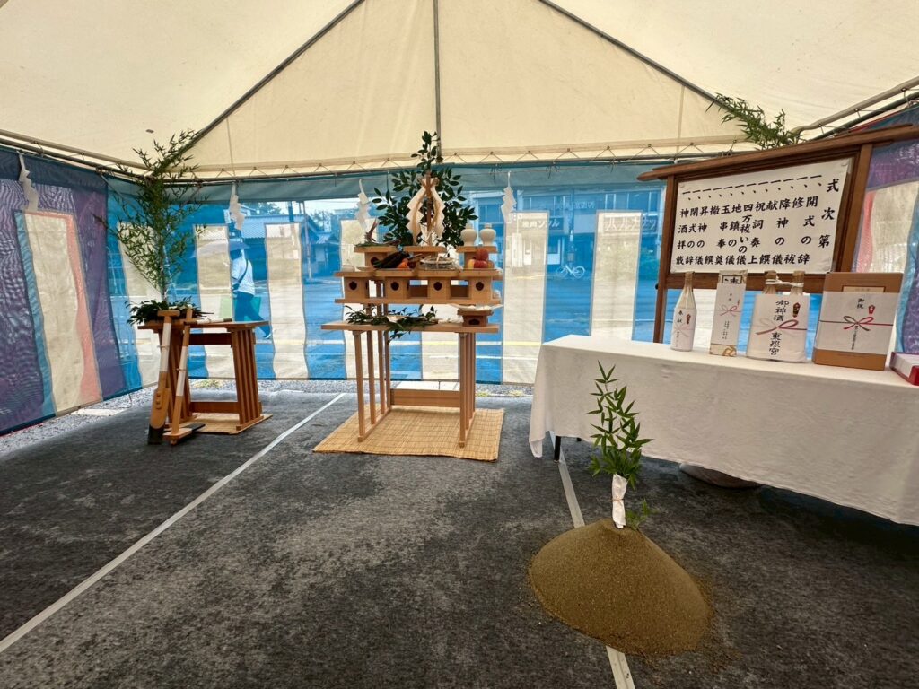 当日はあいにくの雨…ではなく、地鎮祭の日に降る雨は土地がしっかりと固まり、将来の繁栄をもたらす良い兆候とされており、大変縁起の良い雨でした!