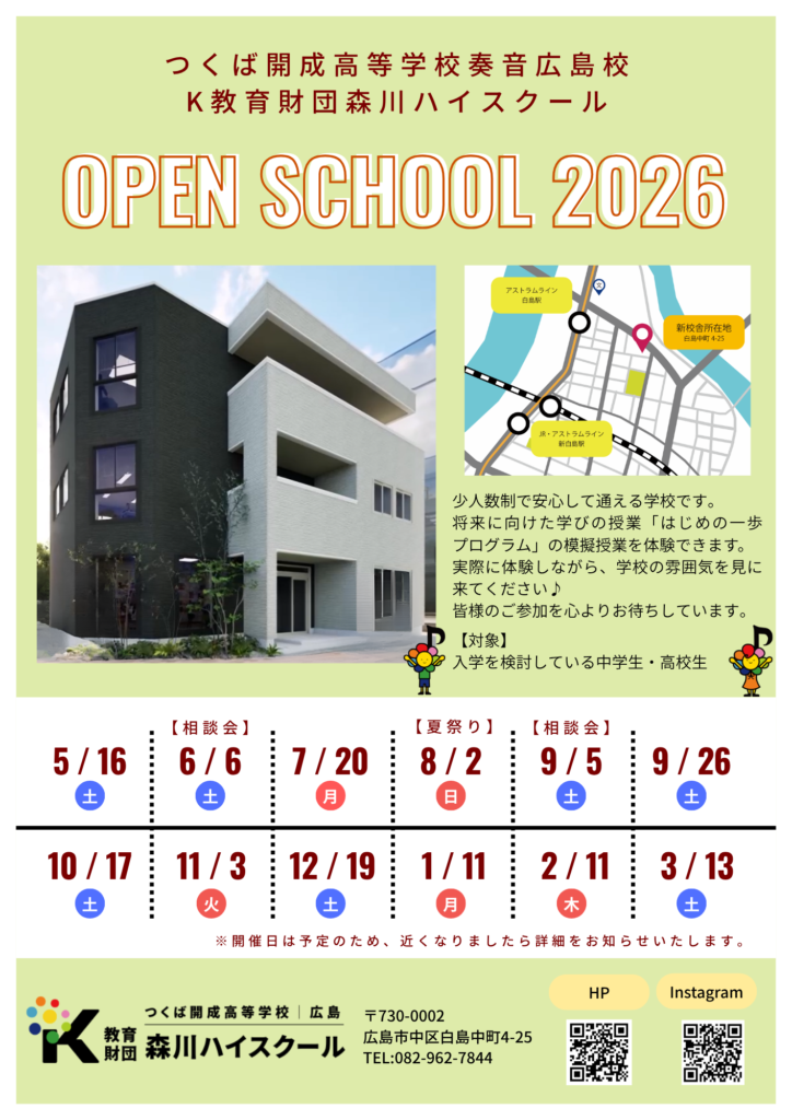 K教育財団森川ハイスクールは広島市中区白島中町に新規開設した私立通信制高校サポート校です。つくば開成高等学校のサポート校として開校していますが、スクーリングも広島の校舎で行うことができます。